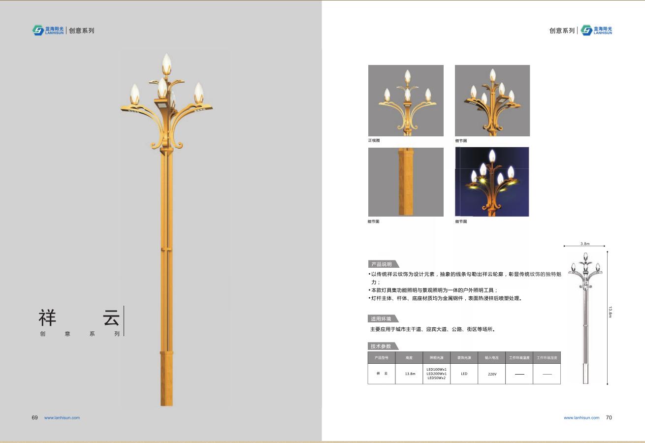 1、高度為6-16米; 2、花葉光源為4組LED光源,色溫2500-6500K,其余光源為LED裝飾光源,每個光源功率為30-60W; 3、LED驅(qū)動電源壽命可達五年; 4、整體熱鍍鋅噴塑,保證燈桿15年不生銹; 5、可以根據(jù)使用地區(qū)的地域文化、產(chǎn)業(yè)特點等進行文化定制;