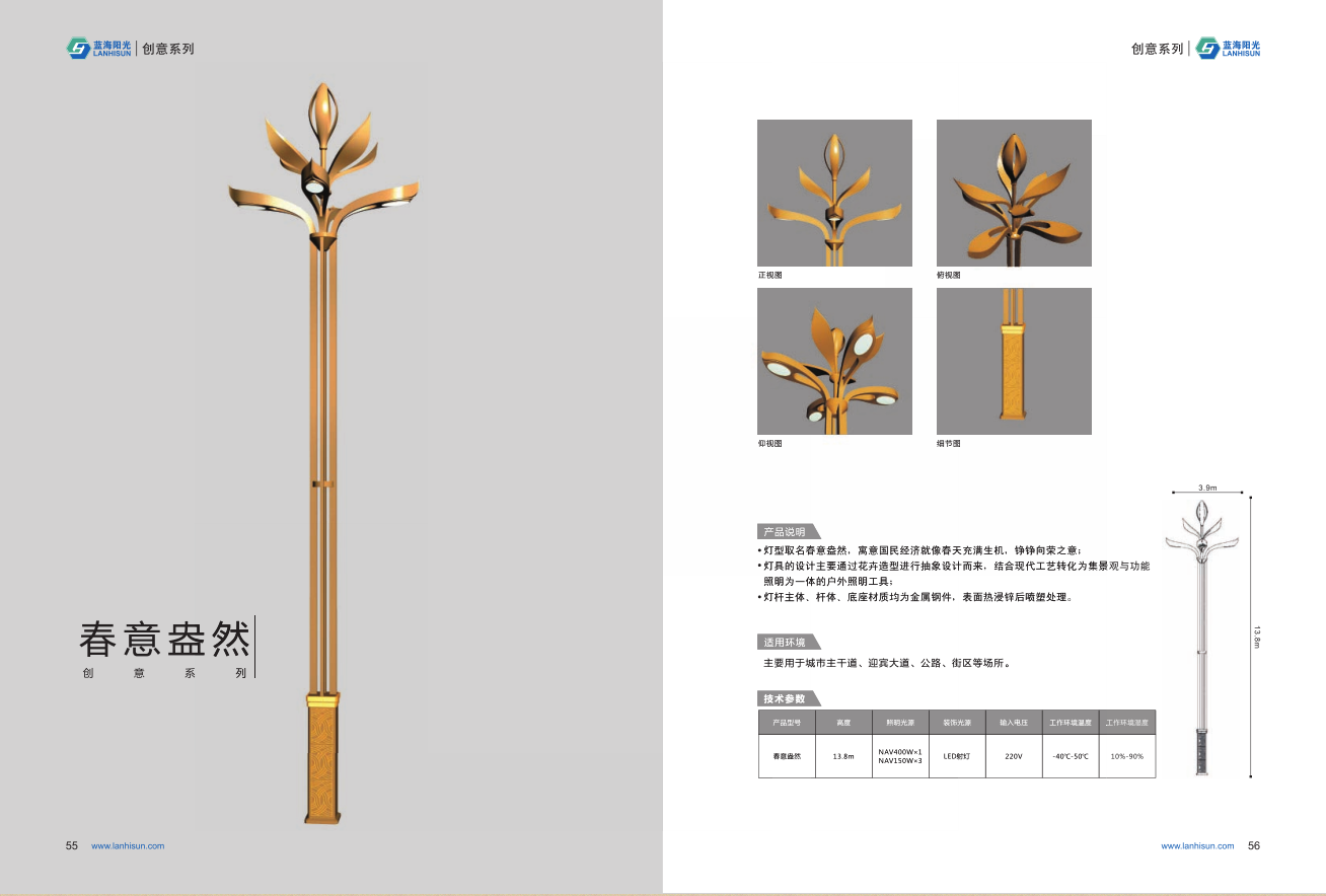 1、高度為6-16米; 2、花葉光源為4組LED光源,色溫2500-6500K,其余光源為LED裝飾光源,每個光源功率為30-60W; 3、LED驅(qū)動電源壽命可達五年; 4、整體熱鍍鋅噴塑,保證燈桿15年不生銹; 5、可以根據(jù)使用地區(qū)的地域文化、產(chǎn)業(yè)特點等進行文化定制;